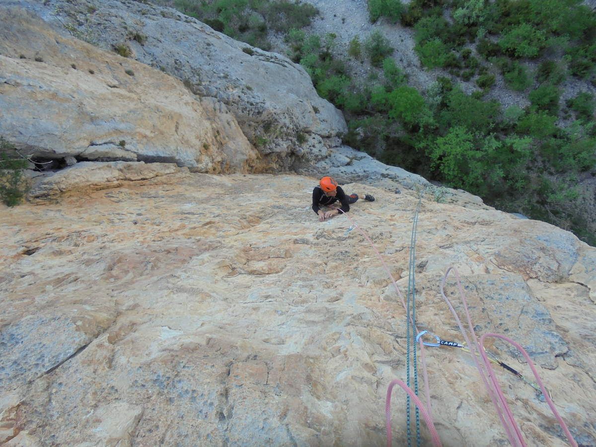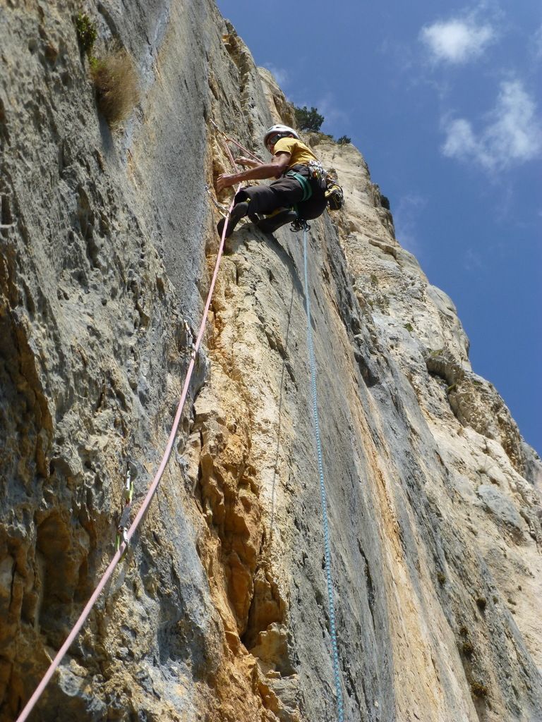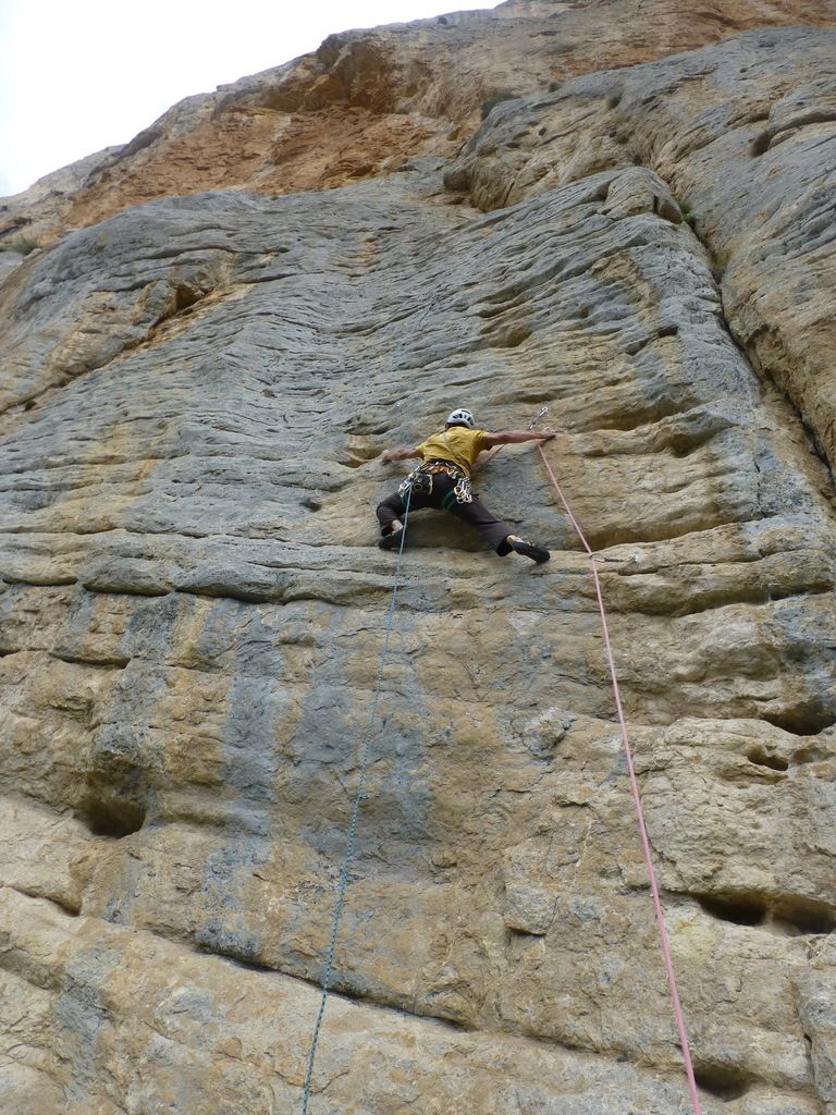 L2: 6c+ un départ dans une fissure équipée trad avec des lunules et pitons ( c'est la voie d'artif de C.Copier que j'ai équipé à demeure ici) puis on vire dans le beau et raide mur ocre de gauche. très belle escalade raide sur des gouttes d'eaux.